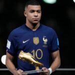 Caption:Kylian Mbappe memegang penghargaan Sepatu Emas sebagai pencetak gol terbanyak turnamen setelah pertandingan final Piala Dunia antara Argentina dan Prancis di Stadion