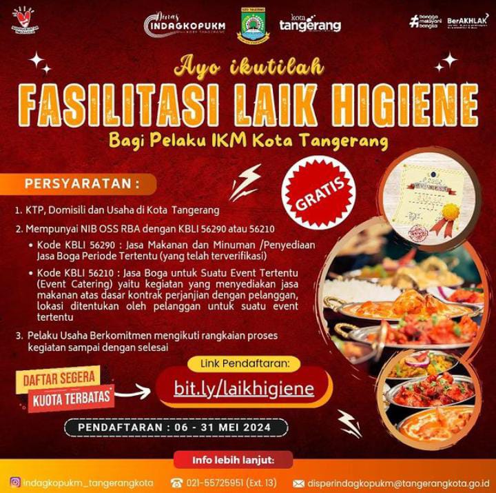 Tangerang,Fixsnews.co.id- Dinas Perindustrian, Perdagangan, Koperasi, Usaha Kecil dan Menengah (Disperindagkop UKM) Kota Tangerang membuka pendaftaran Fasilitasi Laik Higiene gratis bagi pelaku Industri Kecil Menengah (IKM) Kota Tangerang, pada 6 hingga 31 Mei mendatang.