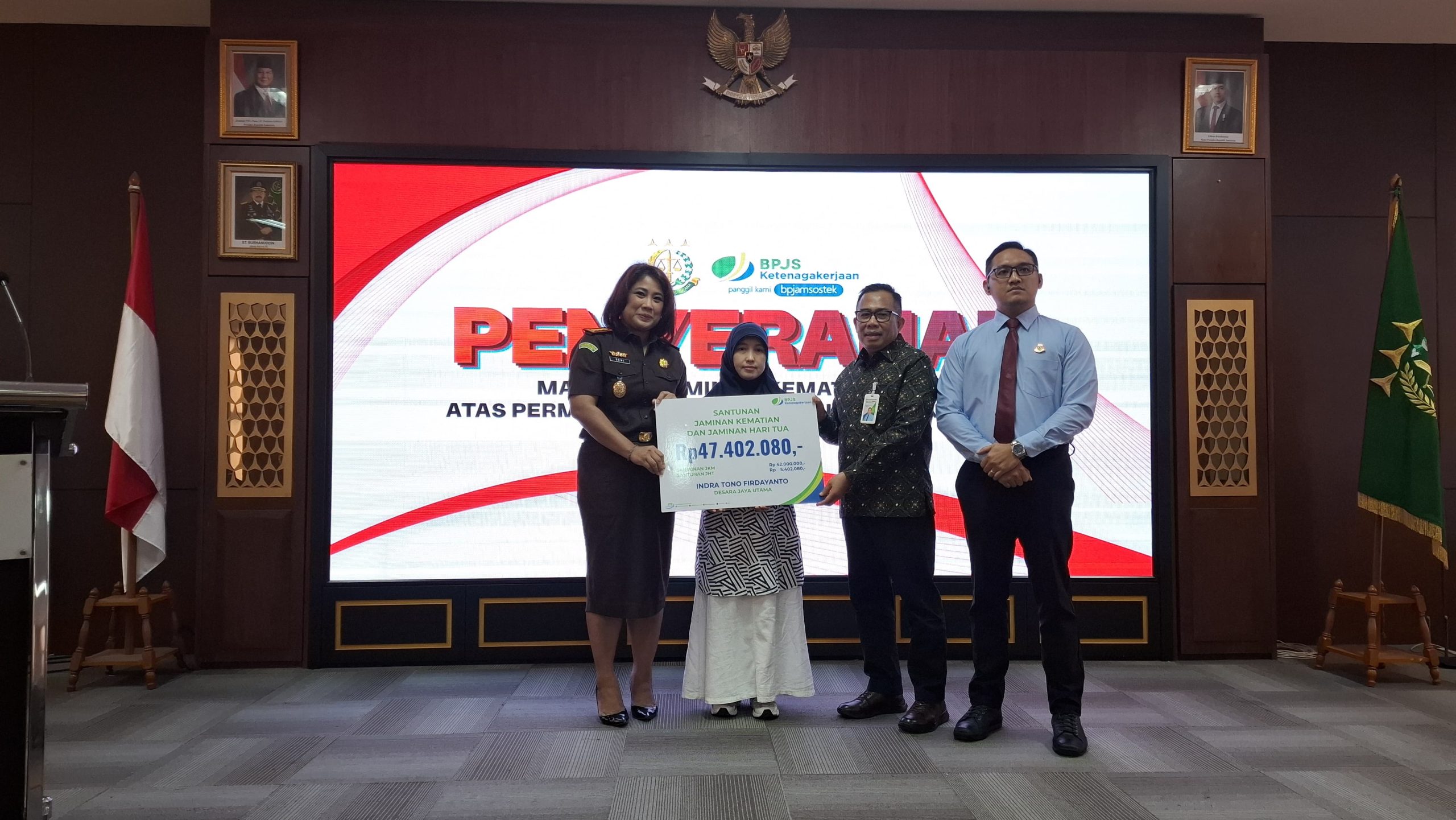 Tangerang Selatan, Fixsnews.co.id- Kejaksaan Negeri Kota Tangerang Selatan, bersama BPJS Ketenagakerjaan Tangerang Selatan menyerahkan santunan Jaminan Kematian (JKM) dan Jaminan Hari Tua (JHT) secara simbolis kepada ahli waris almarhum Bapak Indra Toni Fidayanto, seorang peserta BPJS Ketenagakerjaan dari PT Desara Jaya Utama.