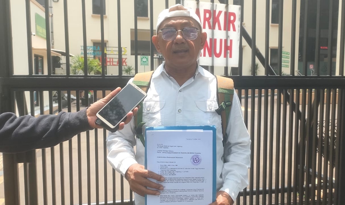 Caption:Aktivis kebijakan publik Ibnu Jandi saat melaporkan dugaan penyalahgunaan wewenang terkait pemberian tunjangan daerah bagi anggota DPRD Kota Tangerang ke pihak Kejaksaan Negeri Kota Tangerang, Senin (6/10/2025).