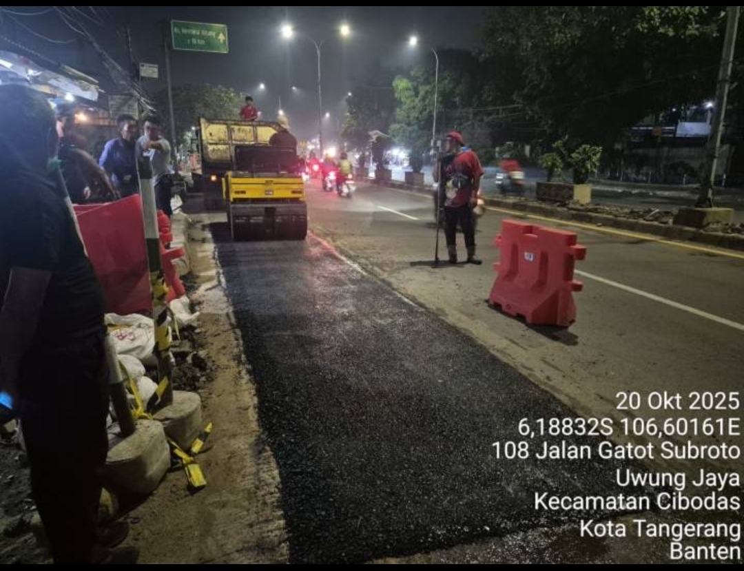 Tangerang,Fixsnews.co.id- Perumda Tirta Benteng Kota Tangerang melakukan perbaikan jalan di sejumlah titik yang terdampak pekerjaan galian pipa jaringan distribusi air, di Jalan Gatot Subroto, Kota Tangerang, Senin (20/10) malam.