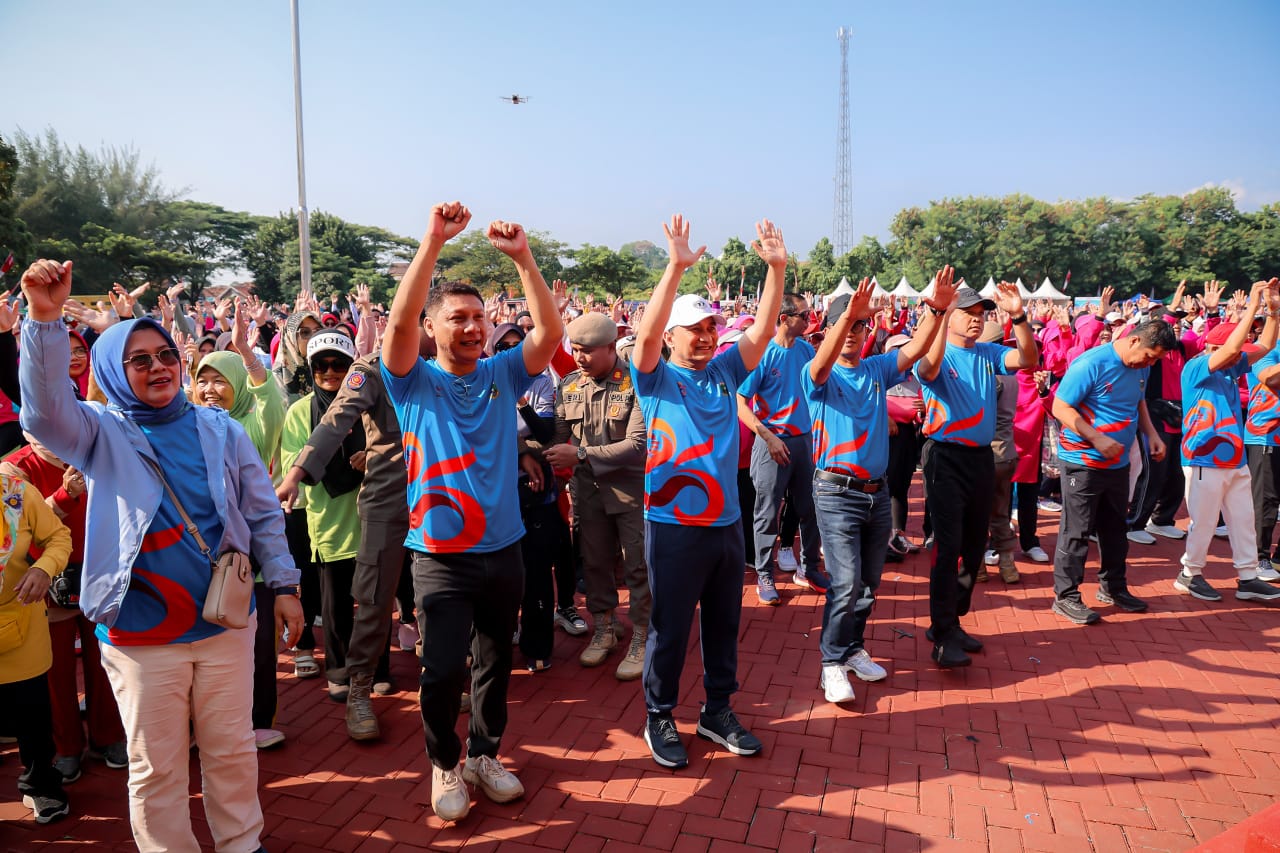 Kegiatan tersebut menjadi salah satu rangkaian utama peringatan HUT Provinsi Banten yang mengusung tema Kolaborasi Kuat untuk Banten Maju Adil Merata dan Tidak Korupsi. Ribuan peserta tampak antusias mengikuti senam yang turut dirangkaikan dengan berbagai layanan masyarakat, seperti pemeriksaan kesehatan gratis, bazar UMKM, gerakan pangan murah, penukaran tabung gas elpiji, pelayanan e-KTP, hingga jajanan gratis.
