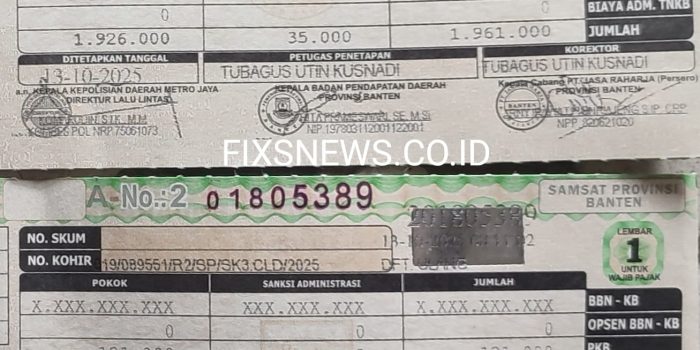 Caption: Gambar rincian jumlah pajak mobil dan motor yang tercantum di STNK milik Ben,(Fixsnews.co.id) Tangerang, Fixsnews.co.id – Ben, warga Kota Tangerang mengaku … Lanjutkan membaca Warga Tangerang Keluhkan Selisih Biaya Pajak Kendaraan di UPT Samsat Ciledug